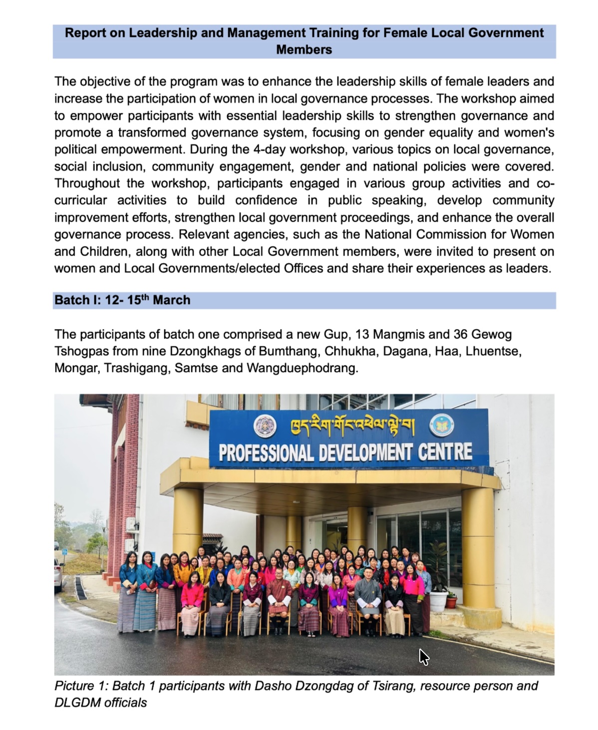 o   Enhancing the performance of LG functionaries through capacity development for 2343 functionaries including females on: leadership and management; local governance and development; gender in planning and governance; sensitization on LG Act and LGRR; leadership and governance; PBG mechanism; and themes identified in capacity development strategy.
